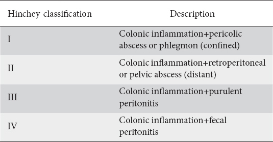 This study was conducted to compare the benefits and disadvantages of different surgical treatments for Hinchey III or IV type of colon diverticulitis. Stage 2 is colonic inflammation with a retroperitoneal or pelvic abscess. In this study the Hinchey classification I-IV was also adopted for right-sided diverticulitis I-IV.