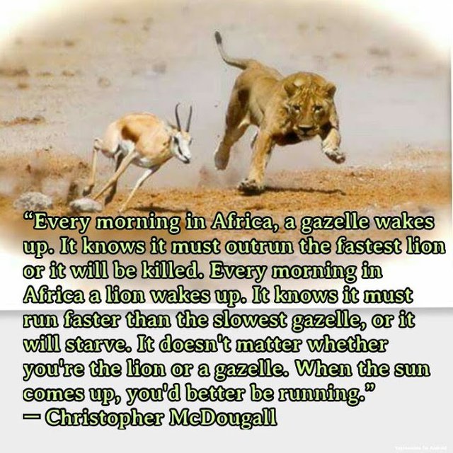 Every morning a lion wakes up. Everyday in Africa a gazelle wakes up and knows he must run faster than the fastest lion or be eaten Everyday in Africa a lion wakes up and knows he must run faster than the slowest gazelle or starve It doesnt matter whether you are the lion or the gazelle when the sun comes up YOU BETTER BE RUNNING.