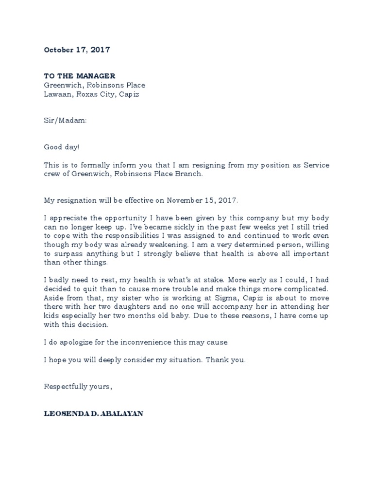 The primary line need to list the company name home address and townzipcode. Please accept this letter of resignation from the position of kitchen chef effective two weeks from today. Sample resignation letter Jollibee 1.